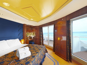 Suite s balkónom/panoramatickým oknom: 21-47m², (Royal 53m², Family 52m²)kajuta s manželskou posteľou (na požiadanie 2 oddelené postele) a rozkladacia pohovka. Klimatizácia, kúpeľňa s vaňou, toaletný stolík, priestorná skriňa, interaktívna TV, telefón, minibar, sejf, sušič na vlasy. Balkón so stolíkom a stoličkami/panoramatické okno. Internetové pripojenie (za poplatok).