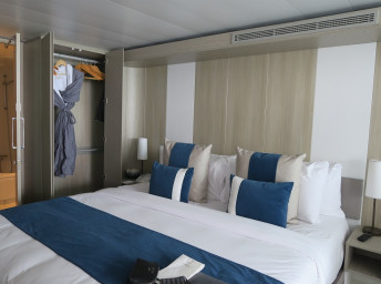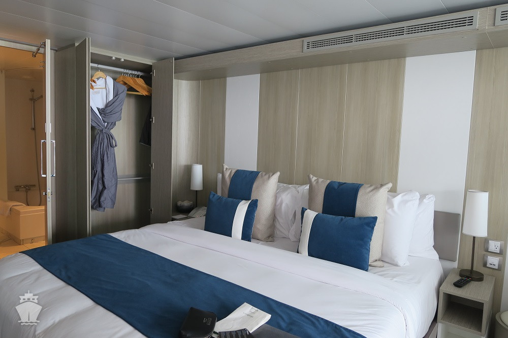 Všetky dvojposteľové kajuty sú vybavené manželskými posteľami veľkosti King (193 x 203 cm) s kašmírovou posteľnou bielizňou, zatiaľ čo sólo Infinite Veranda kajuty majú postele veľkosti Queen (152 x 203 cm) .