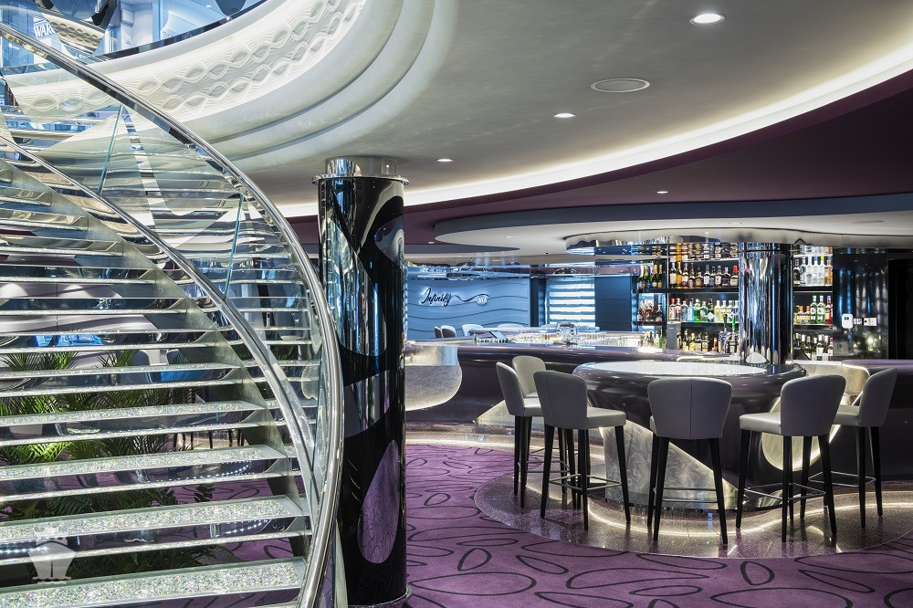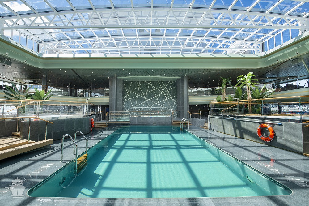 - 5 bazénov vrátane 25-metrového Atmosphere bazéna na 15. palube, 10-metrového vnútorného Bamboo bazéna a bazéna Horizon na korme lodi súžasným výhľadom