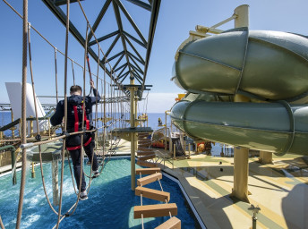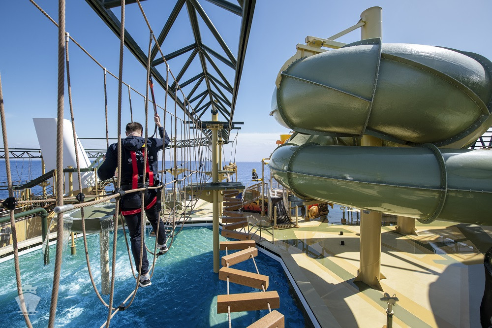 - Himalájsky most na19. palube, s lanovou dráhou vo výške 80 metrov nad vodou