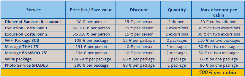 Ponuka neplatí na plavbu okolo sveta a na ázijské plavby (Costa Victoria a Costa neoRomantica). Kredit neplatí pre špeciálne dvojbalíčky exkurzií na Diadema, Luminosa a Magica.