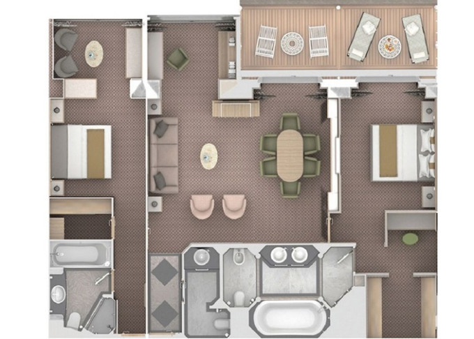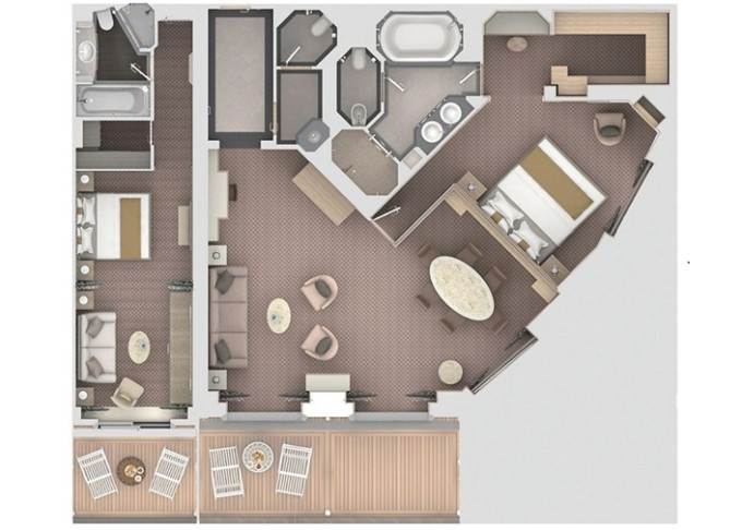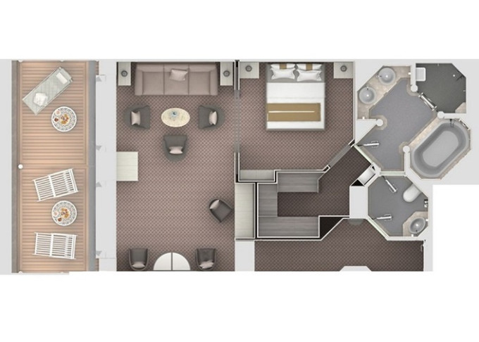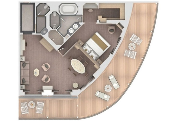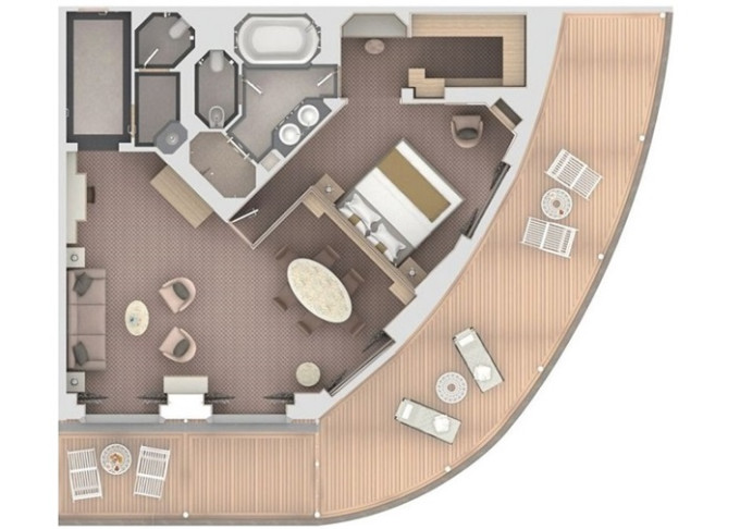 O2 - Owner's Suite 2 119 - 129 m² (vrátane veľkej verandy). Owners Suite O1 spojená s Panorama Suite. 9. paluba - stred. Max 5 osôb. | 64 800 € 32 400 € za osobu |