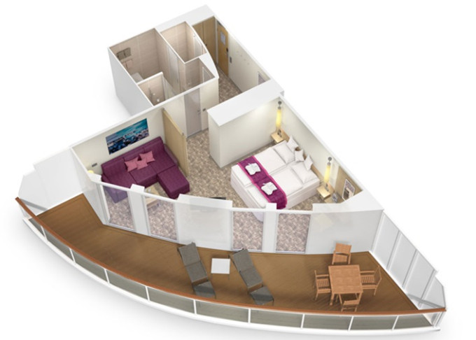 JA - Junior-Suite s balkónom PREMIUM 34 m² + terasa 27,5 m². 8. až 15. paluba. Max 4 osoby. Cenový model Premium + výhody Junior Suite. | 5 590 € 2 795 € za osobu |