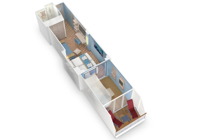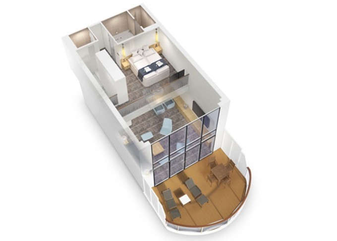 DB - Kajuta s verandou Deluxe PREMIUM 17,5 m² + balkón 12 m². 11. až 17. paluba. Max 5 osôb. Cenový model Premium. | 3 690 € 1 845 € za osobu | ||