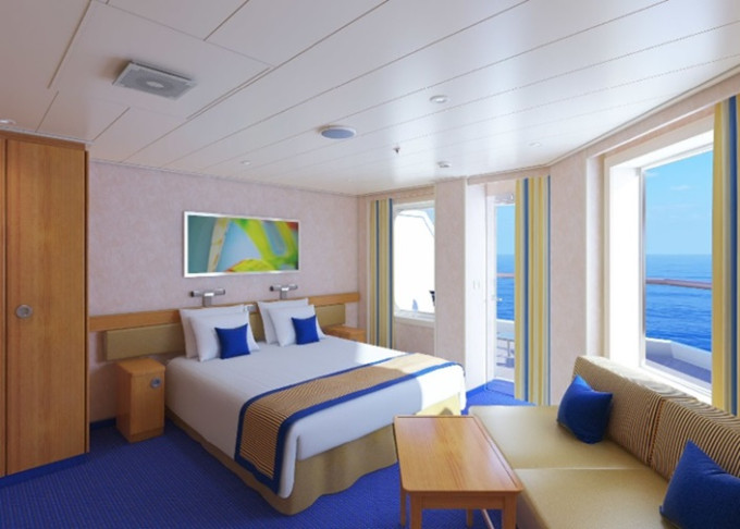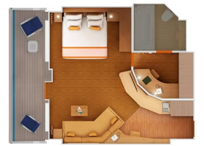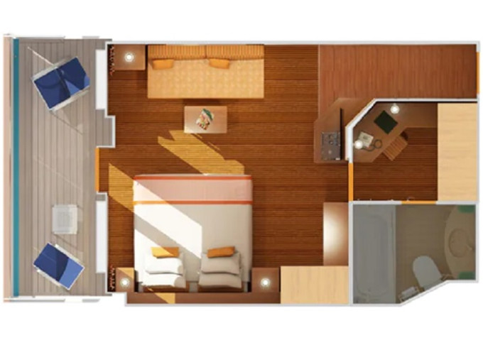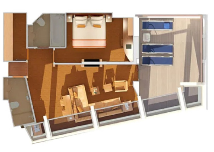 9C - Kajuta s balkónom Premium Vista 21 m² + rohový balkón 7 m². 6,7,8. paluba vzadu. | 2 800 € 1 400 € za osobu |