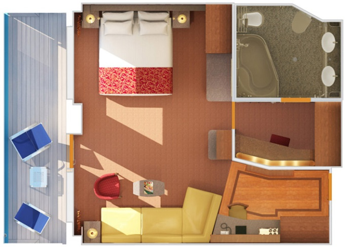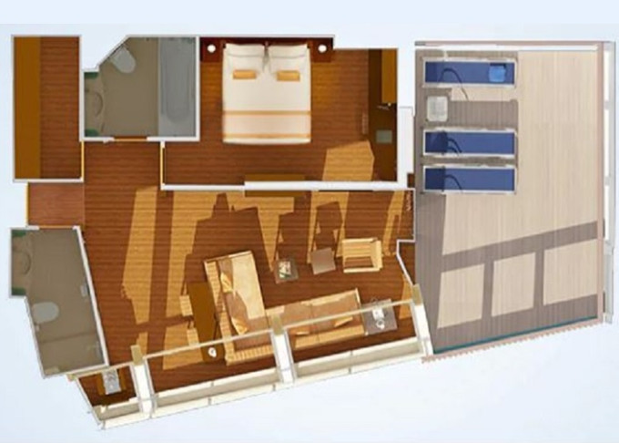 9C - Kajuta s balkónom Premium Vista 17 m² + rohový balkón 7 m². 6,7,8. paluba vzadu. | 1 008 € 504 € za osobu |