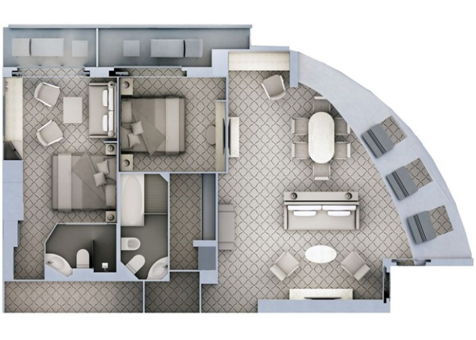 G2 - Grand Suite 2 122 m² (vrátane 2 balkónov 18,5 m² spolu). Grand Suite G1 spojená s Veranda Suite. 7. paluba. Max 5 osôb. | 180 600 € 60 200 € za osobu |