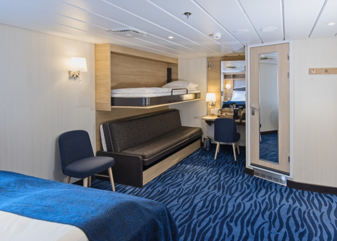 Q3 - Expedition Mini Suite 16-17 m². Neotvárateľné okno. TV, sejf, minibar, kávovar, varná kanvica. 4. paluba. Max 3 osoby. Výhody Suite. | 19 996 € 9 998 € za osobu |