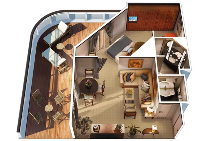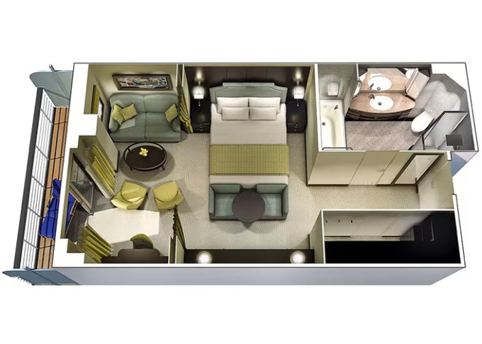 OS - Owner’s Suite 123 m² + balkón s vírivkou od 62 m². 8. až 10. paluba vzadu. Max 2-3 osoby. 4 izby: vstupná hala s pianom, spálňa, veľká obývacia miestnosť s jedálenskou časťou, 2 kúpeľne (1 s vírivkou), 2 šatníky. Výhody Owners Suite. | 31 418 € 15 709 € za osobu |