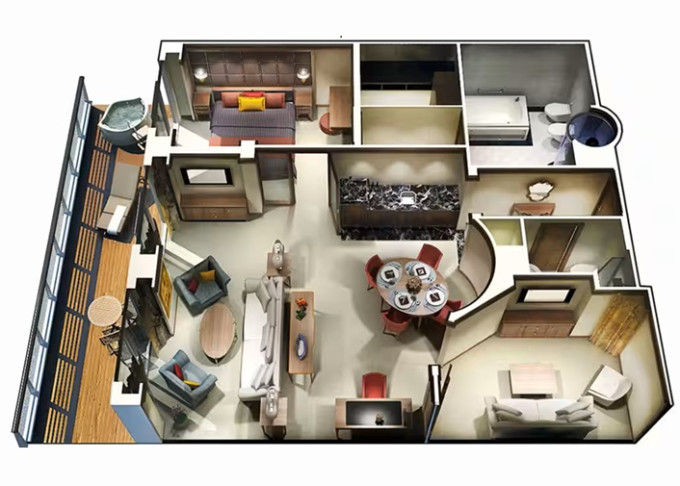 VS - Vista Suite od 87 m² + balkón s vírivkou od 24 m². 8,9,10,12. paluba. Max 2-3 osoby. 3 izby: spálňa, veľká obývacia miestnosť s jedálenskou časťou, zariadená fitness miestnosť, 2 kúpeľne (1 s vírivkou), šatník. Výhody Vista Suite. | 23 918 € 11 959 € za osobu |