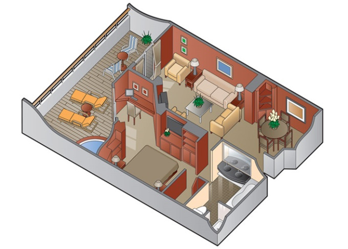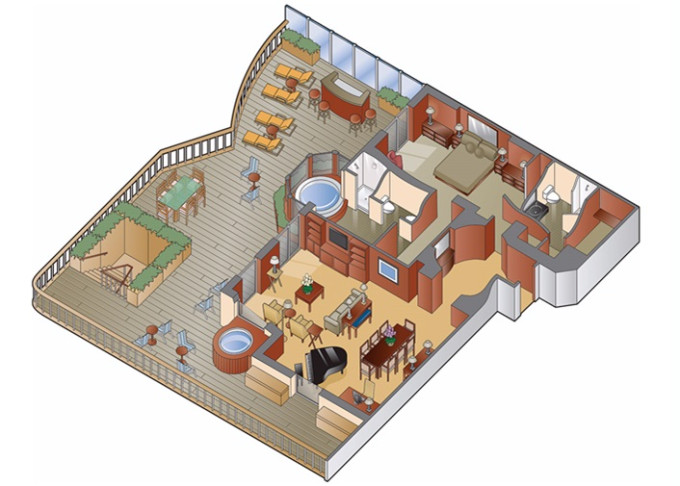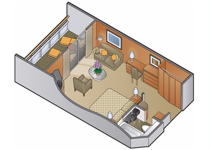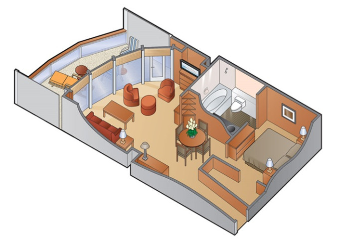 CS - Celebrity Suite 43 m² + balkón 8 m². Vírivka. 6. až 9. paluba. Max 3 osoby. Výhody Suite. Vstupná hala, spálňa s TV, šatník, kúpeľňa s vaňou a sprchou, obývačka, media center, 52-inch TV so surround sound. 13 289 € 13 289 € za osobu