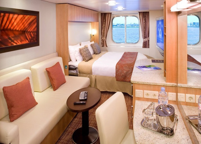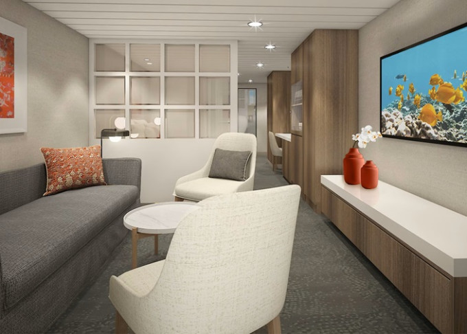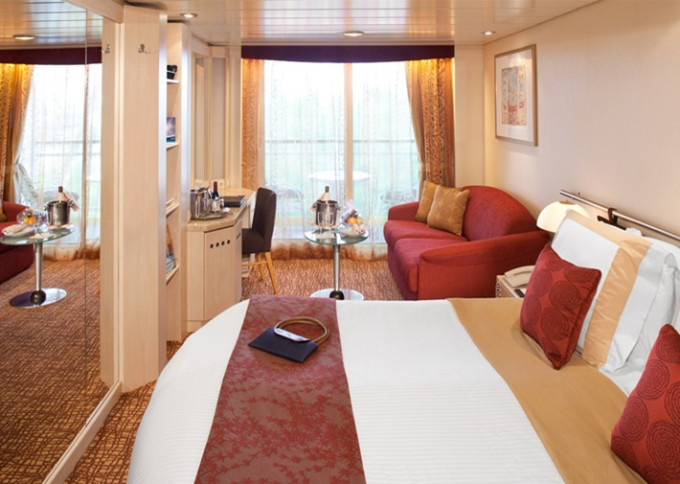 • Kajuty sú umiestnené v blízkosti lodného Spa. K ich vybaveniu patrí posilnený systém vzdušnej filtrácie, posteľ Queen-Size (v kategóriách Edge King-Size), veľké zasúvacie sklenené dvere, exkluzívne posteľné prádlo eXhale®, veľkorysé skladovacie priestory.