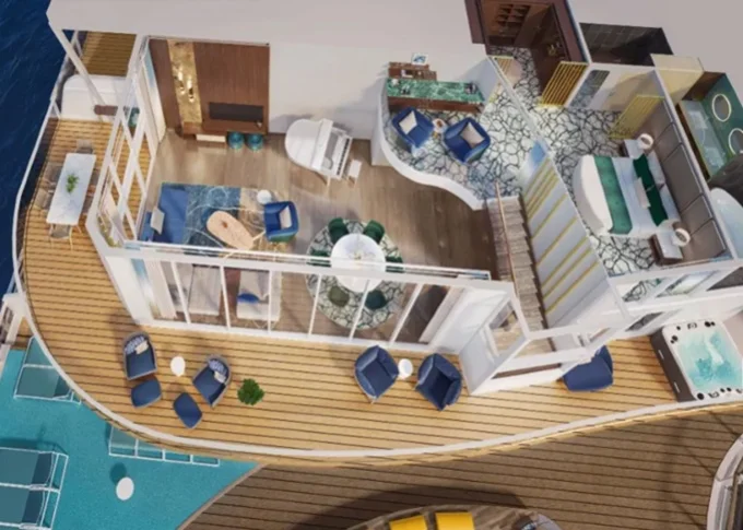 OS - Owner’s Suite 61 m² + 17,5 m² balkón s výhľadom na more. 16,17. paluba vpredu. Max 5 osôb. Výhody Royal Suite Sky class. | 15 582 € 7 791 € za osobu | ||
