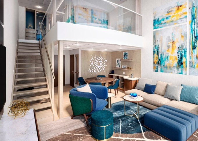 IL - Icon Loft Suite 2-podlažný apartmán. 60 m² + 14-17 m² balkón s výhľadom na more. 17, 18. paluba vpredu. Max 4 osoby. Výhody Royal Suite Star class. | 19 401 € 6 467 € za osobu | ||