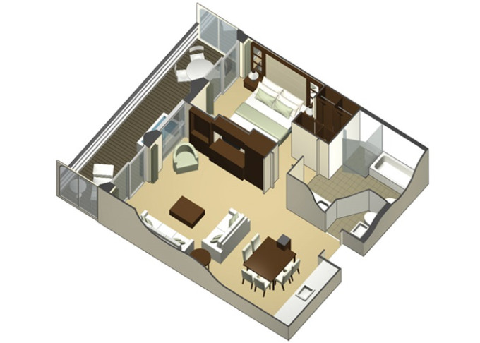 S1 - Sky Suite 28 m² + balkón 7 m². 6. až 12. paluba. Max 4 osoby. Výhody Suite The Retreat. | 16 165 € 16 165 € za osobu |