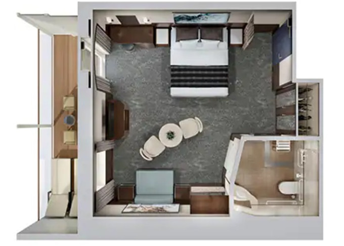 SD - Aft-facing Penthouse 52-54 m² / balkón 18 m². 8. až 0. paluba - vzadu. Max 4 osoby. Výhody Suite. | 13 340 € 6 670 € za osobu | ||
