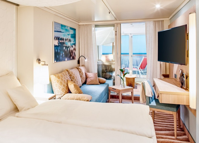 VB - Kajuta s verandou Komfort PREMIUM od 17 m² + balkón od 4 m². 9. až 15. paluba. Max 4 osoby. Cenový model Premium. | 2 380 € 1 190 € za osobu | ||