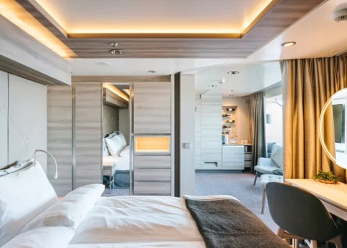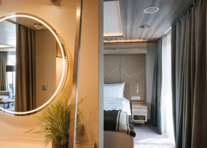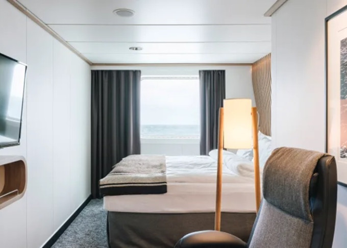 Úžasná scenéria sa odráža v bohatom a pohodlnom dizajne interiéru. Škandinávske prírodné materiály, ako žula, dub, breza a vlna, boli použité na vytvorenie štýlových kajút a verejných priestorov. Všetky kajuty sú vonkajšie, pričom 50 % má vlastný balkón, a apartmány na korme majú súkromné vonkajšie vírivky s nádherným výhľadom.