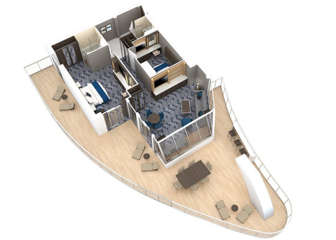 A1 - Spacious AquaTheater Suite / 2 spálne 76 m² + balkón 71 m². 2 spálne, 2 kúpeľne. 8. paluba. Max 4-8 osôb. Výhody Royal Suite Star Class. | 10 256 € 5 128 € za osobu |