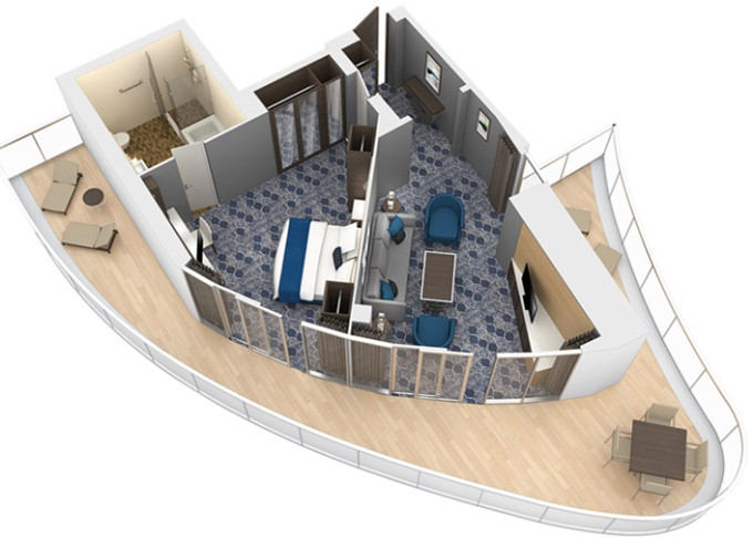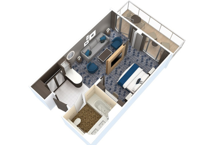 1A - Veľká kajuta s veľkým balkónom Ultra Spacious 34 m² + balkón 7 m². 11. paluba. Oddelená časť s poschodovou posteľou. Max 6 osôb. | 2 739 € 2 739 € za osobu |