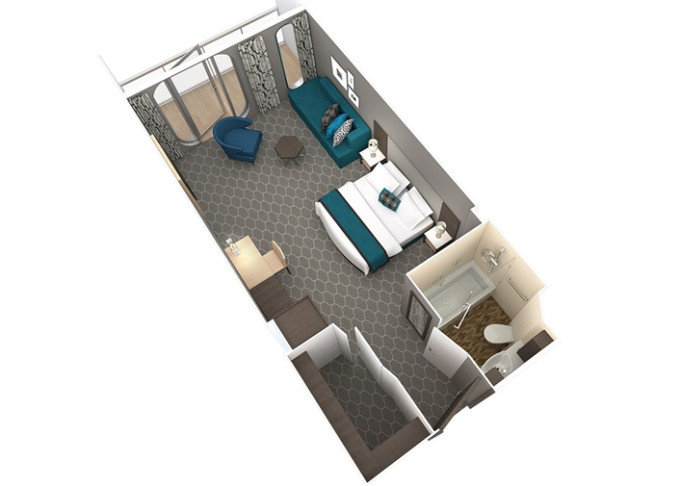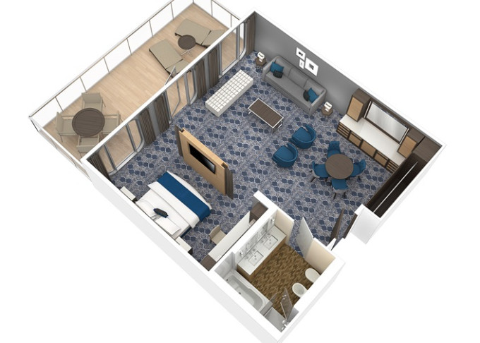 J4 - Junior Suite s balkónom 27 m² + balkón 7,5 m². Max 5 osôb. Výhody Royal Suite Sea Class. | 3 662 € 1 831 € za osobu | ||