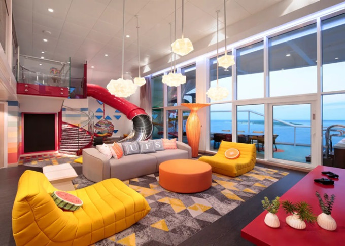 US - Ultimate Family Suite 230 m² + balkón s vírivkou 50 m². 2 podlažia. 3 spálne, kĺzačka, 85-palcová Tv, in-suite kino, karaoke station. Max 10 osôb. Výhody Royal Suite Star Class. | 14 907 € 4 969 € za osobu |