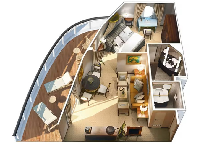 OS - Owner’s Suite 58 m² + rohový balkón 32 m². 6,7,8. paluba vzadu. Max 2-4 osoby. Spálňa, predelená obývacia a jedálenská časť, onyxová kúpeľňa so sprchovacím kútom, extra wc. Výhody Owners Suite. 29 238 € 14 619 € za osobu