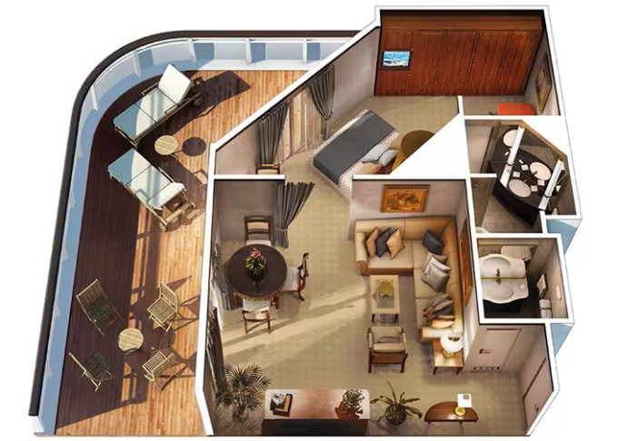 PH1 - Penthouse Suite 24 m² + balkón 6 m². 8. paluba stred. Max 2-3 osoby. Spálňa s obývacou časťou, kúpeľňa so sprchovacím kútom. Výhody Penthouse Suite. 17 118 € 8 559 € za osobu