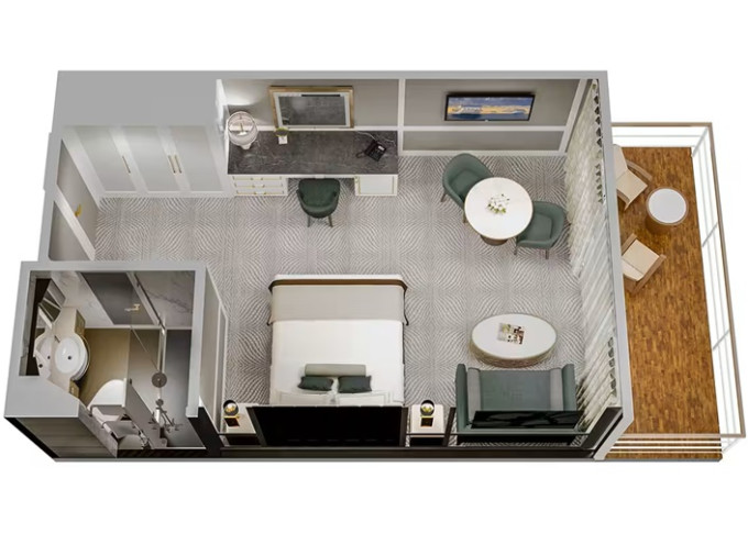 PH3 - Penthouse Suite 24 m² + balkón 6 m². 8. paluba. Max 2-3 osoby. Spálňa s obývacou časťou, kúpeľňa so sprchovacím kútom. Výhody Penthouse Suite. 16 358 € 8 179 € za osobu