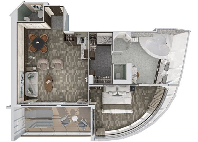 H2 - The Haven Deluxe Owner's Suite 79 m² / balkón 11 m². 16,17. paluba - vpredu, stred. Max 4 osoby. Výhody The Haven. | 9 616 € 4 808 € za osobu |