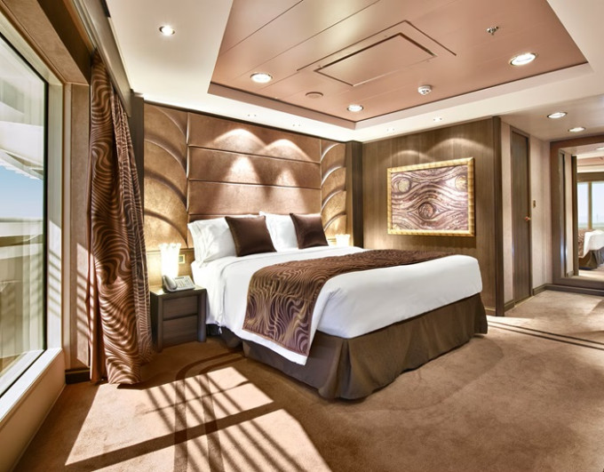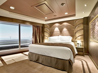 Suite s balkónom/panoramatickým oknom: 21-47m², kajuta s manželskou posteľou (na požiadanie 2 oddelené postele) a rozkladacia pohovka. Klimatizácia, kúpeľňa s vaňou, toaletný stolík, priestranná skriňa, interaktívna TV, telefón, minibar, sejf, sušič na vlasy. Balkón so stolíkom a stoličkami/panoramatické okno. Internetové pripojenie (za poplatok).