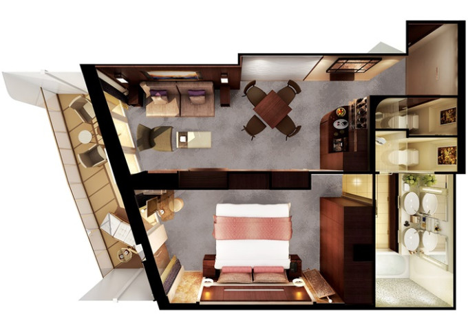 M1 - Club Suite Aft-facing 47 m² / balkón 19 m². 10. paluba - vzadu. Max 2 osoby. Výhody Club. | 3 526 € 1 763 € za osobu |