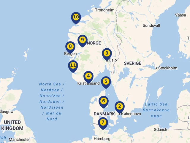 4Kristiansand, Nórsko02. 09. 2026, príchod o 08:00, odchod o 18:00