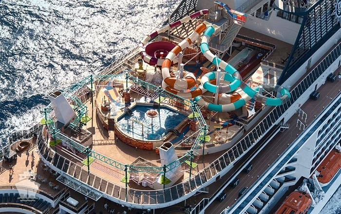 - 2 vírivky, 2 soláriá, Aquapark Savannah s vysokorýchlostným toboganom Champagne Bowl a Himalájskym mostom, ktorý sa tiahne po celej šírke paluby lode