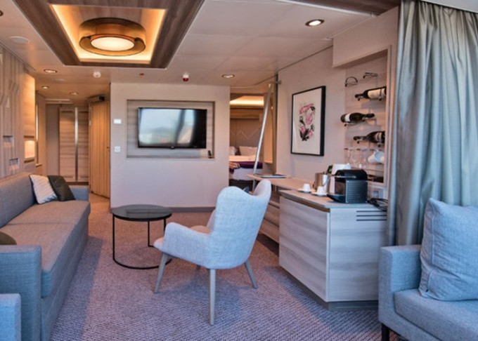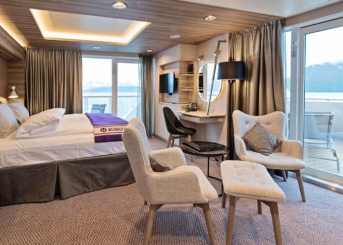 MD - Expedition Large Suite s balkónom ♿ 35 m². Balkón. TV, minibar, varná kanvica, kávovar. Bezbariérová kajuta♿ 7. paluba vpredu. Max 4 osoby. Výhody Suite. | 19 992 € 9 996 € za osobu | ||