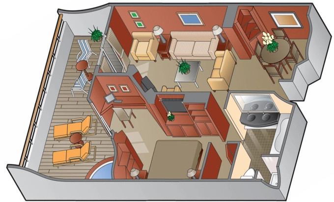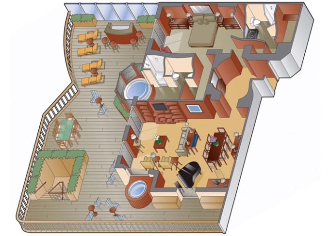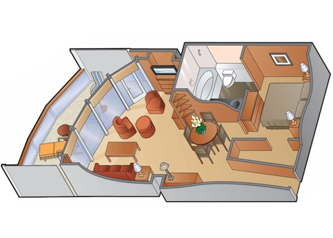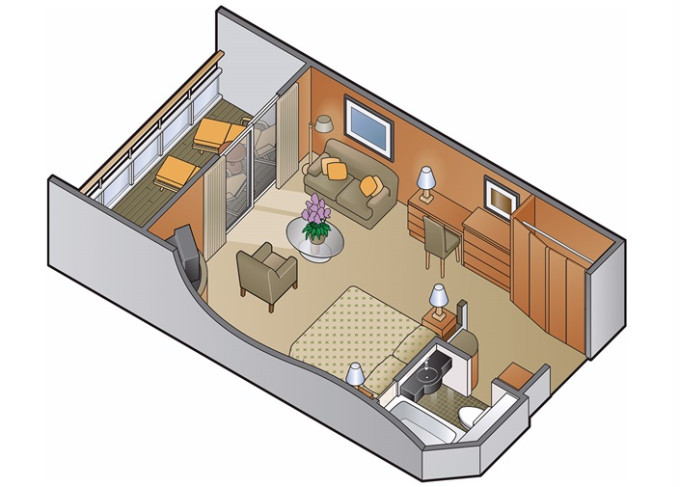 CS - Celebrity Suite 43 m² + balkón 8 m². Kúpeľňa s vírivkou. 6. až 9. paluba stred. Max 3 osoby. Výhody Suite The Retreat. | 7 357 € 7 357 € za osobu |