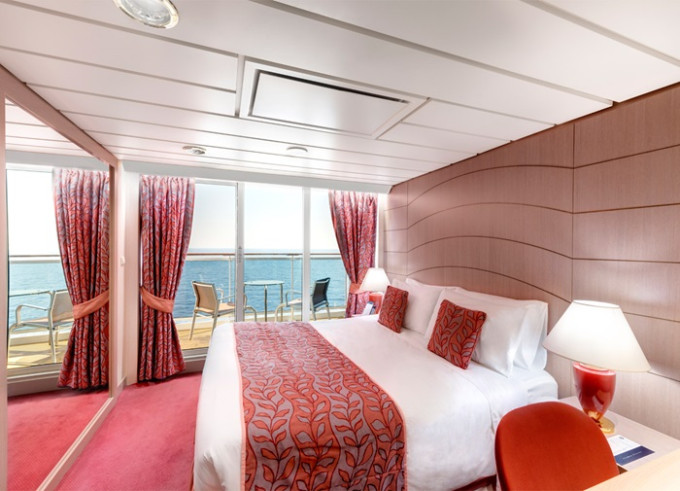 Suite s balkónom: cca 27m² kajuta s manželskou posteľou (na požiadanie 2 oddelené postele) a rozkladacia pohovka. Klimatizácia, kúpeľňa s vaňou, toaletný stolík, priestorná skriňa, TV, telefón, minibar, sejf, sušič na vlasy. Balkón so stolíkom a stoličkami. Internetové pripojenie (za poplatok).