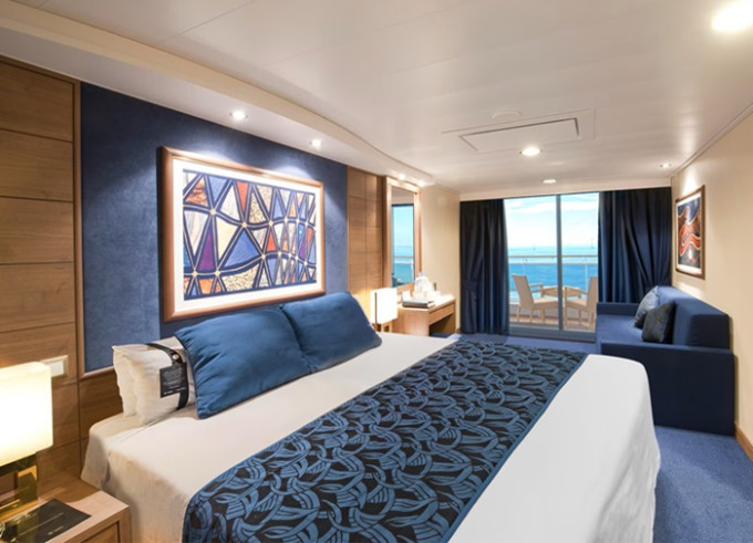 Suite s balkónom: cca 31m² kajuta s manželskou posteľou (na požiadanie 2 oddelené postele) a rozkladacia pohovka. Klimatizácia, kúpeľňa s vaňou, toaletný stolík, priestorná skriňa, TV, telefón, minibar, sejf, sušič na vlasy. Balkón so stolíkom a stoličkami. Internetové pripojenie (za poplatok).