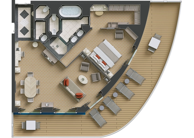 O2 - Owner's Suite 2 119 - 129 m² (vrátane balkóna 12 m²). Owners Suite S1 spojená s Panorama Suite PA 9. paluba - stred. Max 5 osôb. | 68 100 € 22 700 € za osobu |