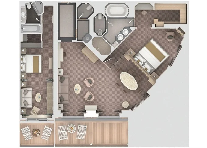 O2 - Owner's Suite 2 119 - 129 m² (vrátane balkóna 12 m²). Owners Suite S1 spojená s Panorama Suite PA 9. paluba - stred. Max 5 osôb. | 45 400 € 22 700 € za osobu |