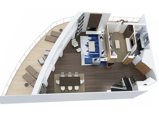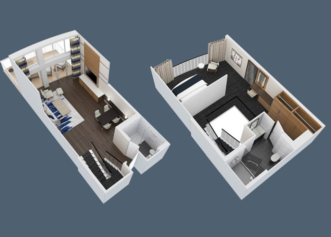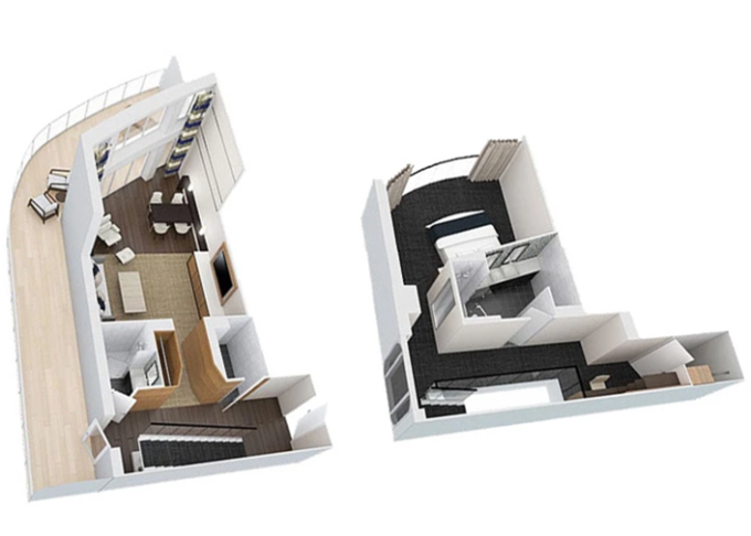 OL - Owner Loft Suite s balkónom 90 m² + balkón 46 m². 2-podlažný apartmán, 2 spálne, 2 kúpeľne. 8. paluba. Max 4 osoby. Výhody Royal Suite Class. | 18 242 € 9 121 € za osobu |