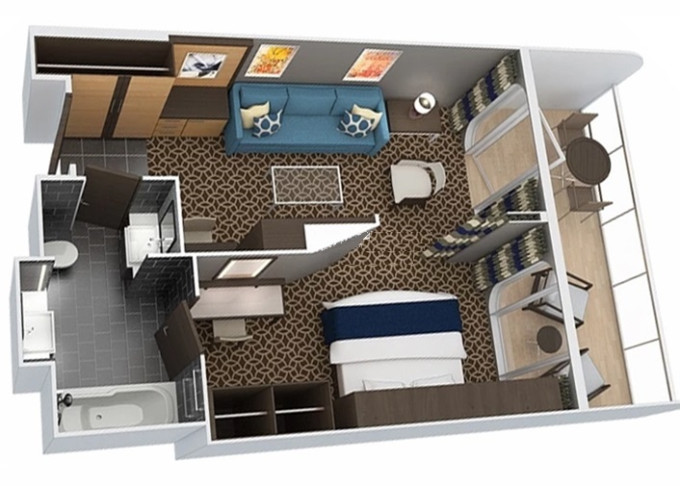 CI - Vnútorná kajuta s virtuálnym balkónom Connecting 15 m². Obrazovka veľkosti balkónových dverí s premietaným výhľadom. Prepojiteľná kajuta. 3/7. až 13. paluba. Max 2-4 osoby. | 3 176 € 794 € za osobu | ||