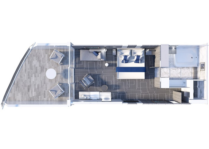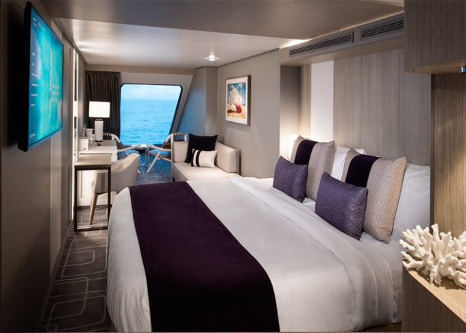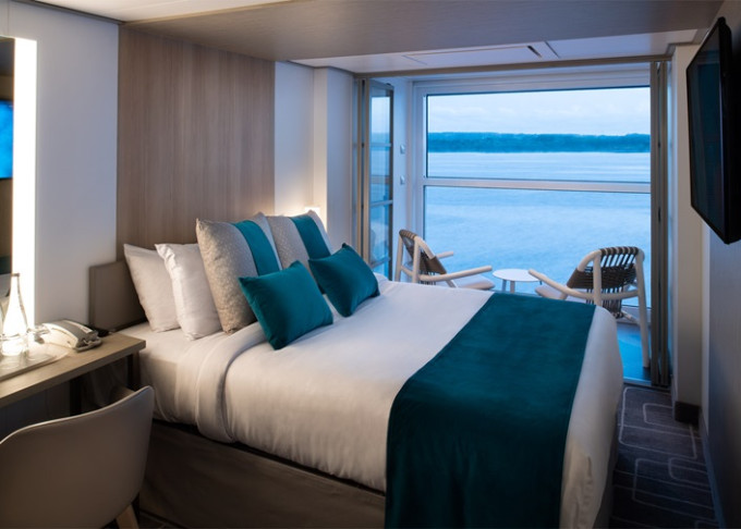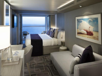 - Kajuty sú umiestnené v blízkosti lodného Spa. K ich vybaveniu patrí posilnený systém vzdušnej filtrácie, posteľ Queen-Size (v kategóriách Edge King-Size), veľké zasúvacie sklenené dvere, exkluzívne posteľné prádlo eXhale®, veľkorysé skladovacie priestory.