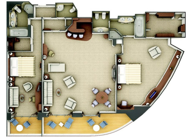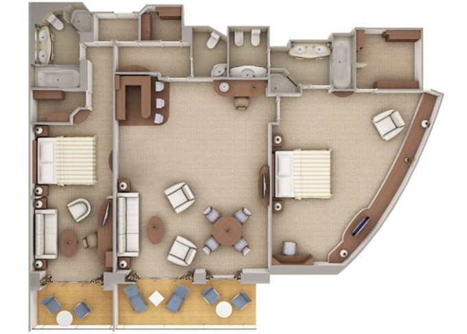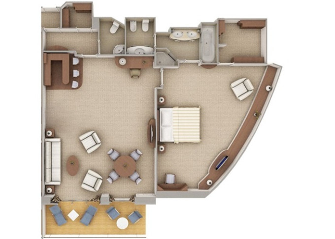 O2 - Owner's Suite 2 117 m² (vrátane balkóna 20 m²). Owners Suite O1 spojená s Vista Suite. 7. paluba stred. Max 5 osôb. | 63 900 € 21 300 € za osobu |