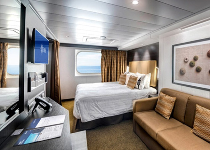Vonkajšia kajuta s neotvárateľným oknom: 15 - 25 m², kajuta s manželskou posteľou (na požiadanie 2 oddelené postele) a 1-2 vyklápacie horné lôžka resp. rozkladacia pohovka. Klimatizácia, kúpeľňa so sprchou a WC, toaletný stolík, skriňa, interaktívna TV, trezor, telefón, sušič vlasov, virtuálna asistentka ZOE, neotvárateľné okno. Kajuty v kategórii Bella a niektoré Junior a Deluxe majú obmedzený výhľad.