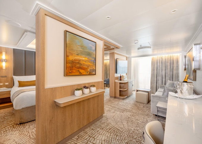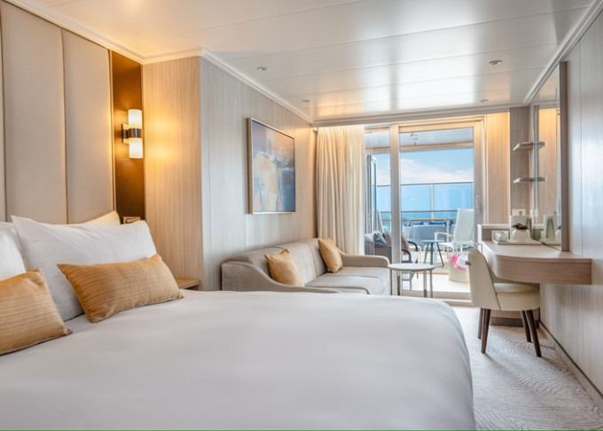 S2 - Signature Owner Suite 59 m² (vrátane balkonu). 10. paluba v strede, 16. paluba na korme. Max 4 osoby. Šatník, kúpeľňa s vaňou, oddelené WC, kávovar Nespresso. Výhody Signature Collection. | 18 672 € 9 336 € za osobu | ||