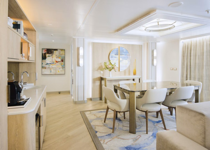 S0 - Signature Sky Suite 117 m² (vrátane balkónu). 16. paluba na korme. Max 5 osôb. Šatník, 2 spálne, obývačka s jedálenskou časťou, 2 kúpeľne (jedna so sprchou), šatník, kávovar Nespresso. Výhody Signature Collection. | 38 324 € 19 162 € za osobu |