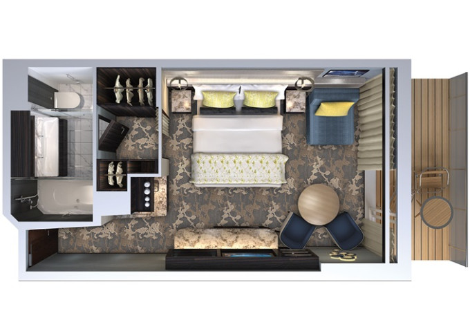 M6 - Club Suite s veľkým balkónom 31-41 m² / balkón 9-13 m². 8,10. paluba - vpredu, vzadu. Max 2-4 osoby. Výhody Club. | 6 786 € 3 393 € za osobu | ||