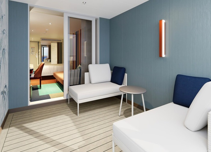 T2 My Cruise - Kajuta s balkónom Terrace 19 m² / lounge + balkón 8 m². 9. paluba stred. Max 2-4 osoby. Cenový model MyCruise. | 1 196 € 299 € za osobu | ||