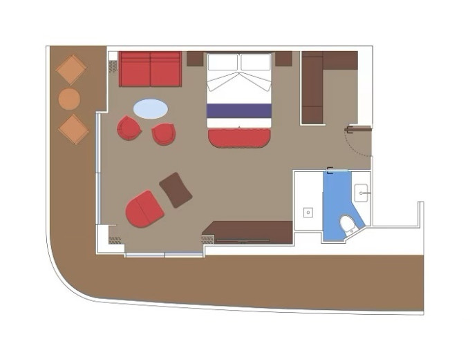 YC3 - Yacht Club Royal Suite s terasou a s vírivou vaňou 51-59 m² / balkón s vírivkou 42-51 m². Oddelená obývačka a spálňa, šatník, kúpeľňa s vaňou. Max 4 osoby. 16/18. paluba. Cenový model MSC Yacht Club. | 11 622 € 5 811 € za osobu | ||